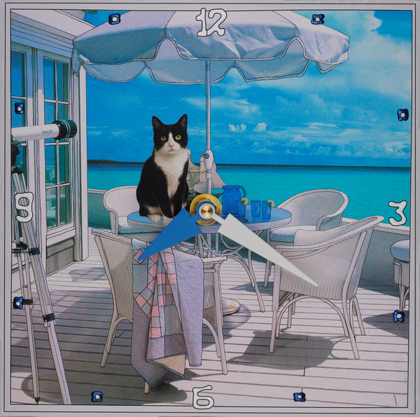 Bring a touch of humor & color to your home using my originally designed collage clock. This collage combines photographic and digital images with ink and painted details on a handmade ceramic base.